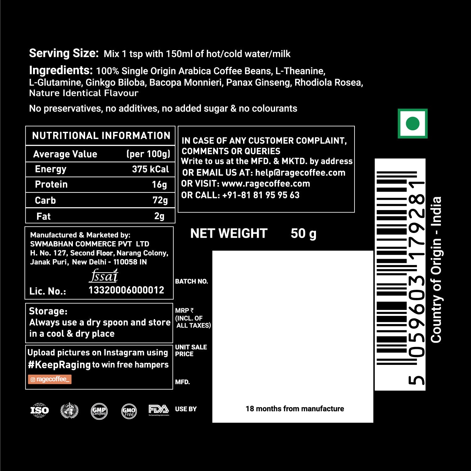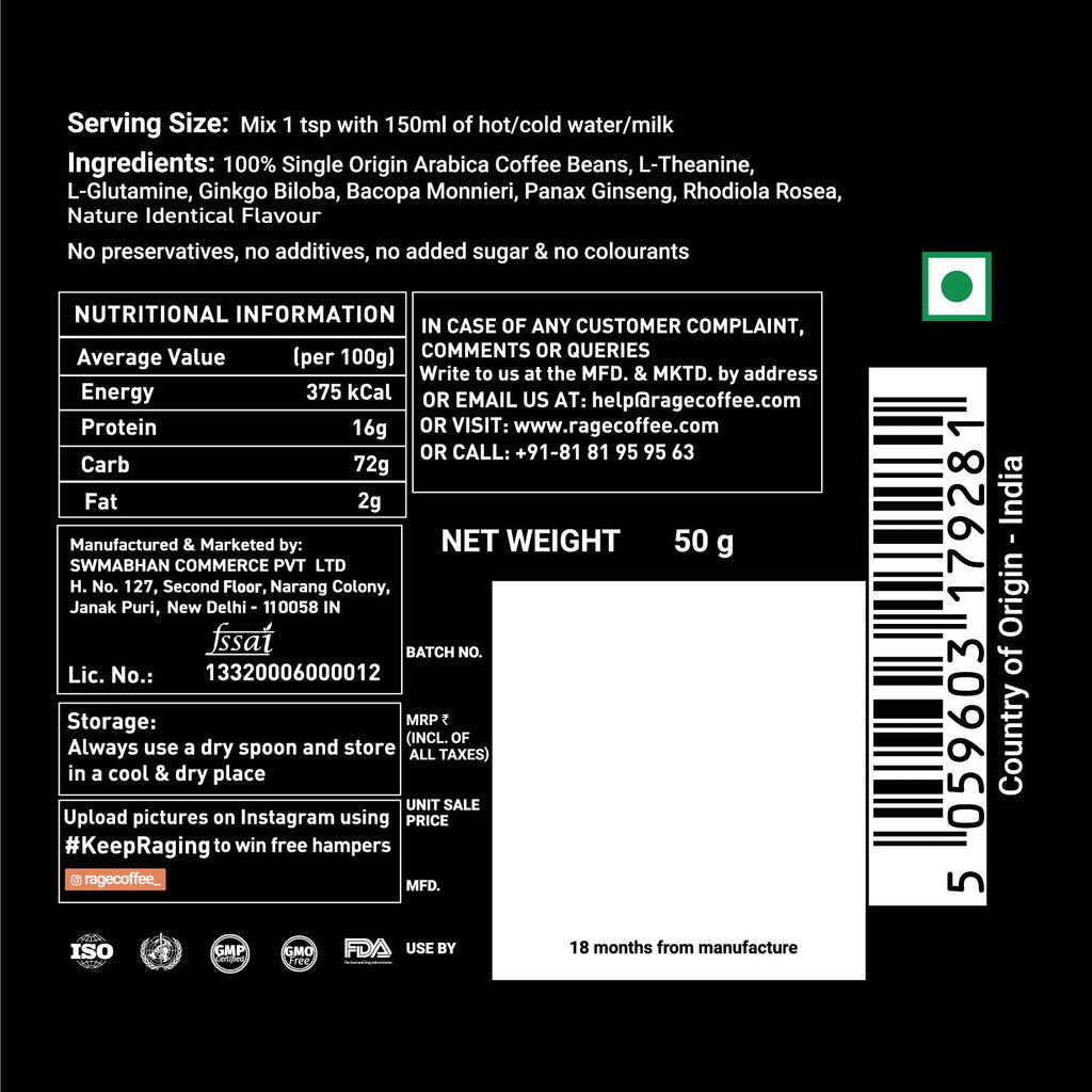 Rage Coffee includes a daily healthy supplementation of L-Theanine, L-Glutamine, Gingko Biloba, Bacopa Monieri, Panax Ginseng & Rhodiola Rosea.  It enhances your physical energy as well as your subjective well being. It can help you excel in all areas by overcoming the physical and mental boundaries with just the perfect combination of caffeine and herbs.
