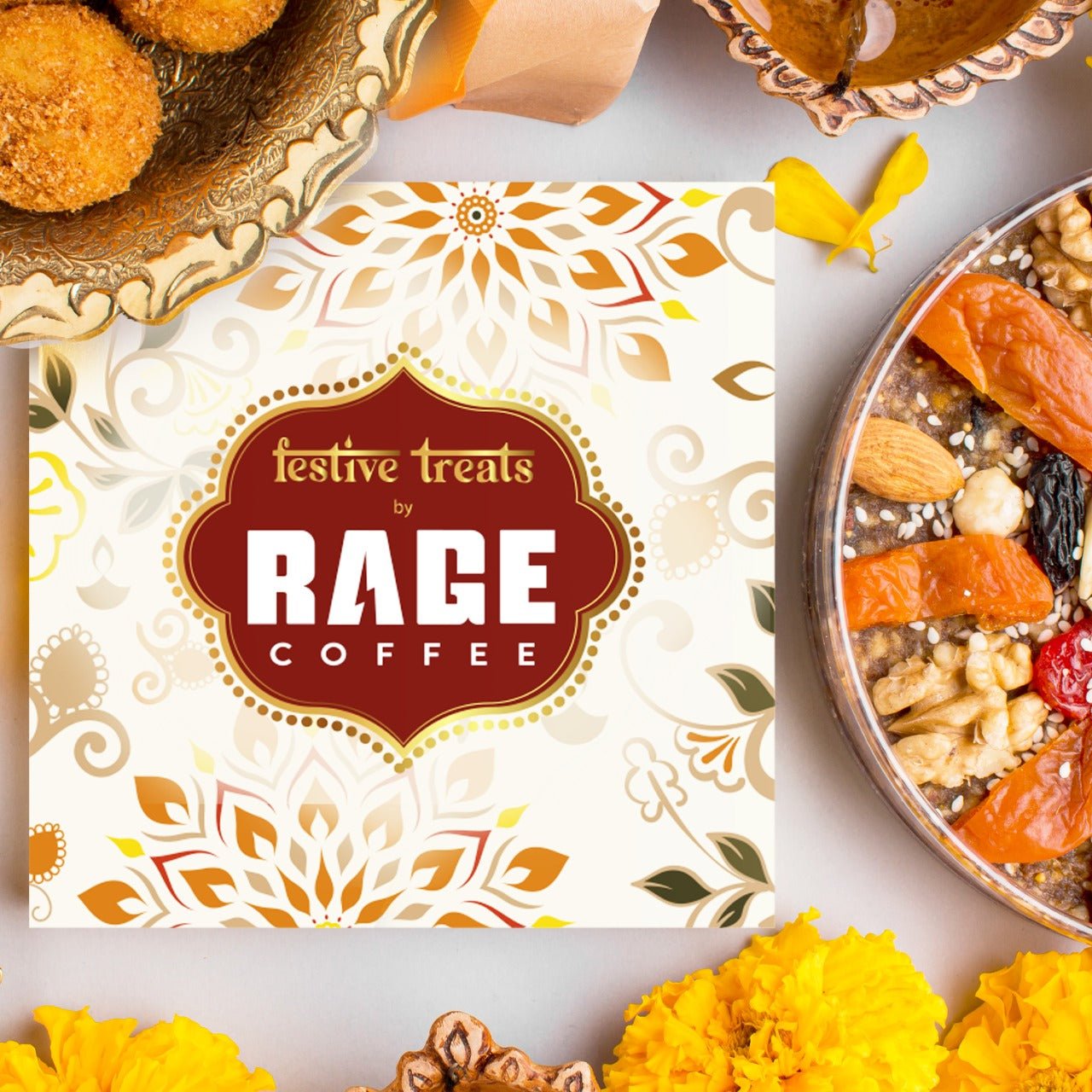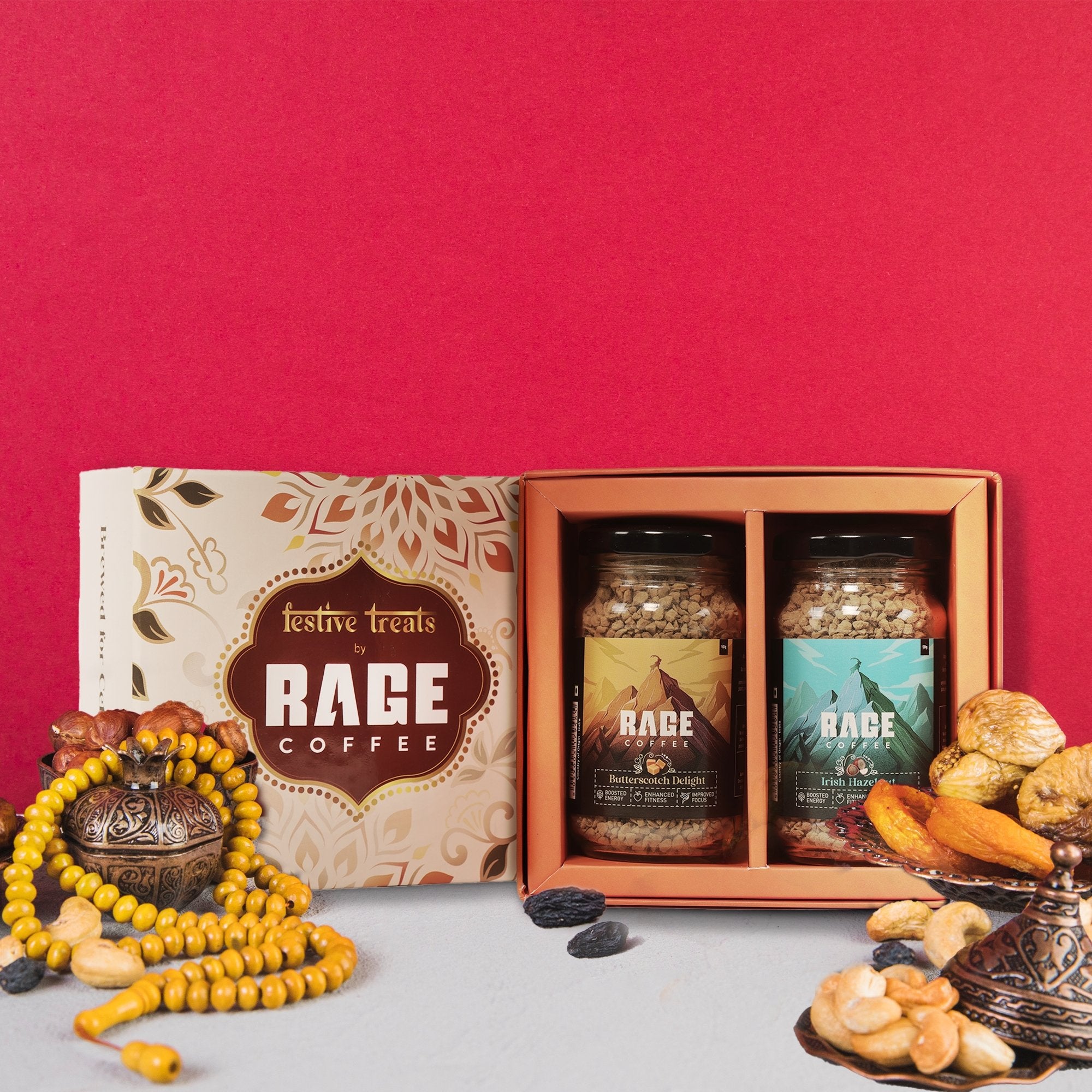 Festive Treats gift box comes in a beautiful box and includes 2 50g jars of the Rager’s Favourite Flavours. 50g Irish Hazelnut and  50g Butterscotch Delight